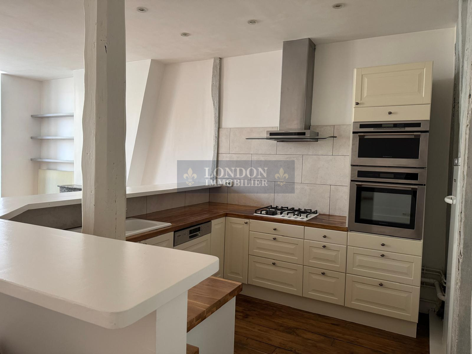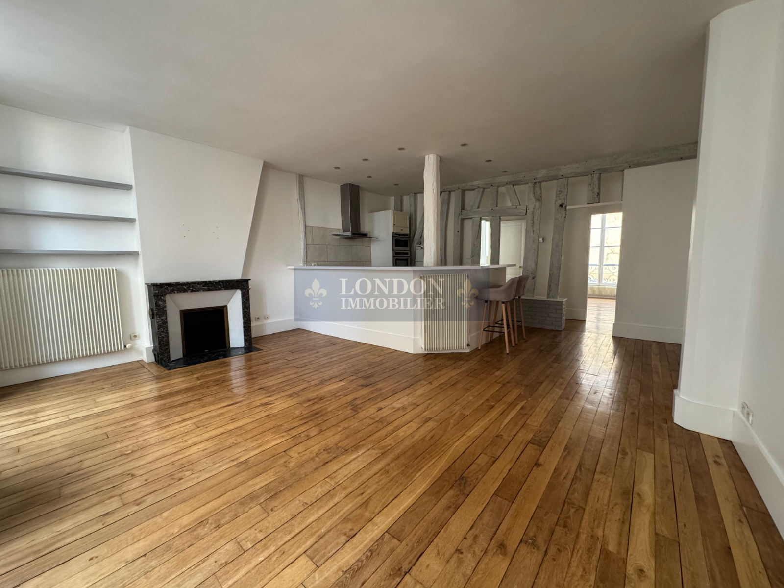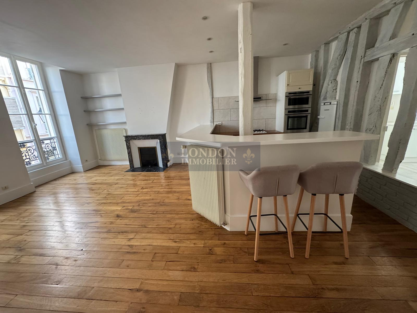 Double séjour ouvrant sur cuisine américaine avec jolies poutres, deux chambres, salle de bains, wc. Hauteur sous plafond, parquets anciens. Très belle rénovation.